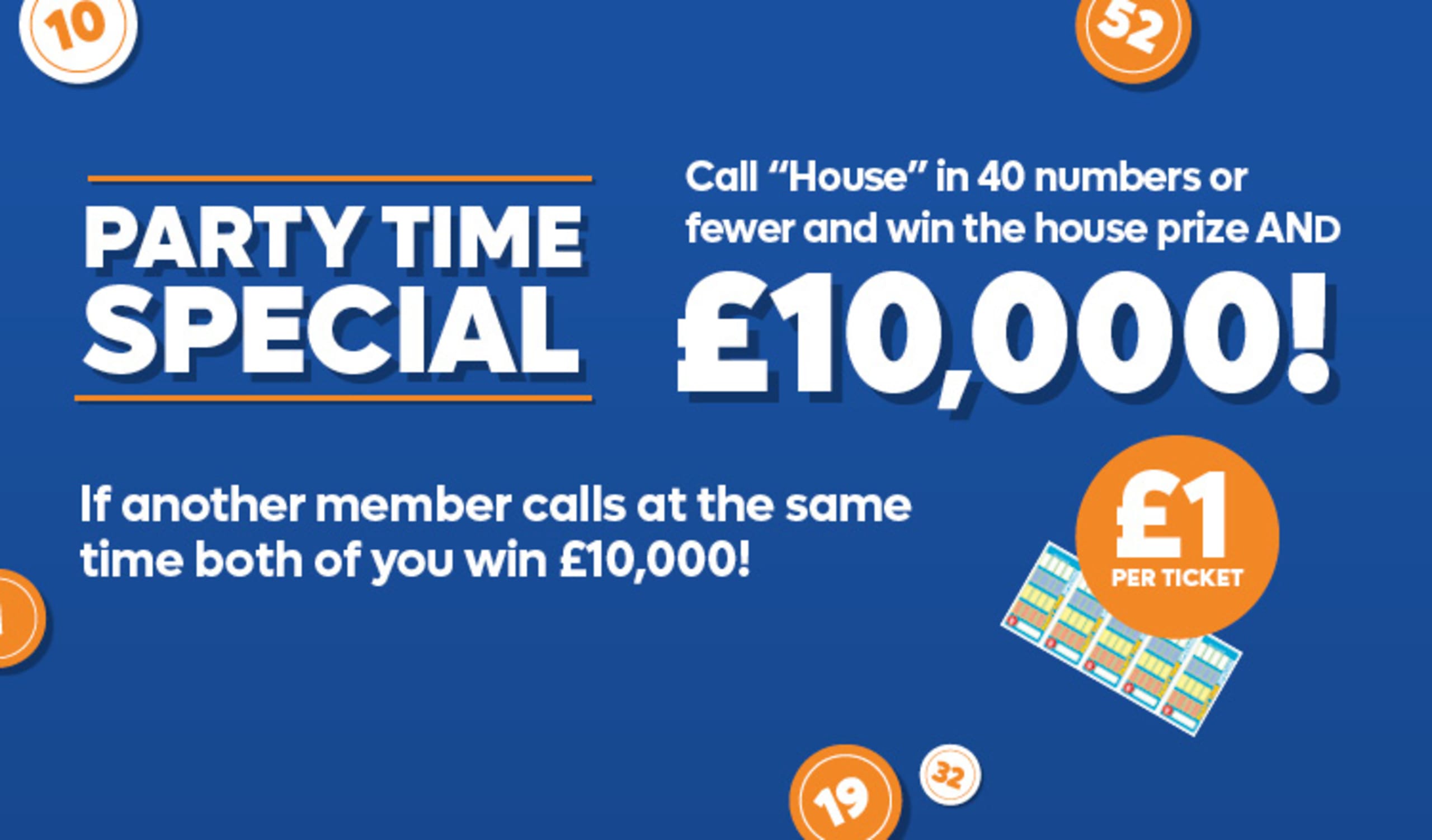 Add Party Time Special bingo to your Main Event and you could win £10,000!