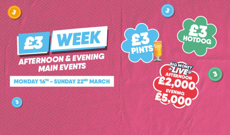 Find ClubThe legal stuff: All information is for this Buzz Bingo club only. Prices shown are for advertised sessions only and replace any other advertised prices. Main Event prize money advertised in club is estimated and therefore subject to change depending on ticket sales. In the event of multiple winners, the prize money will be split equally. Prices stated are for Main Event only unless stated otherwise. Optional games and touchscreen combo packages incur additional costs. Big Money Live tickets to be purchased separately at 6 tickets for £1. *£3 pints include Carlsberg Pilsner pint and Somersby Apple Cider. £3 Pints are not included in Scotland clubs. Buzz Bingo general terms apply. Members only. Please drink responsibly. Clubs reserve the right to stop serving alcohol in line with club terms. £3 Hotdogs whilst stocks last. Owing to our multifunctional kitchen cooking procedures, all fried items may contain traces of all allergens. While we take care to preserve the integrity of our vegetarian/vegan products, we advise that they are prepared in a multi kitchen environment. Please ask a member of the team for allergen and calorie information. We operate a “Think 25” policy, photographic ID will be required. Enjoy the game and play responsibly. Visit www.gambleaware.org or call GamCare free on 0808 802 0133.