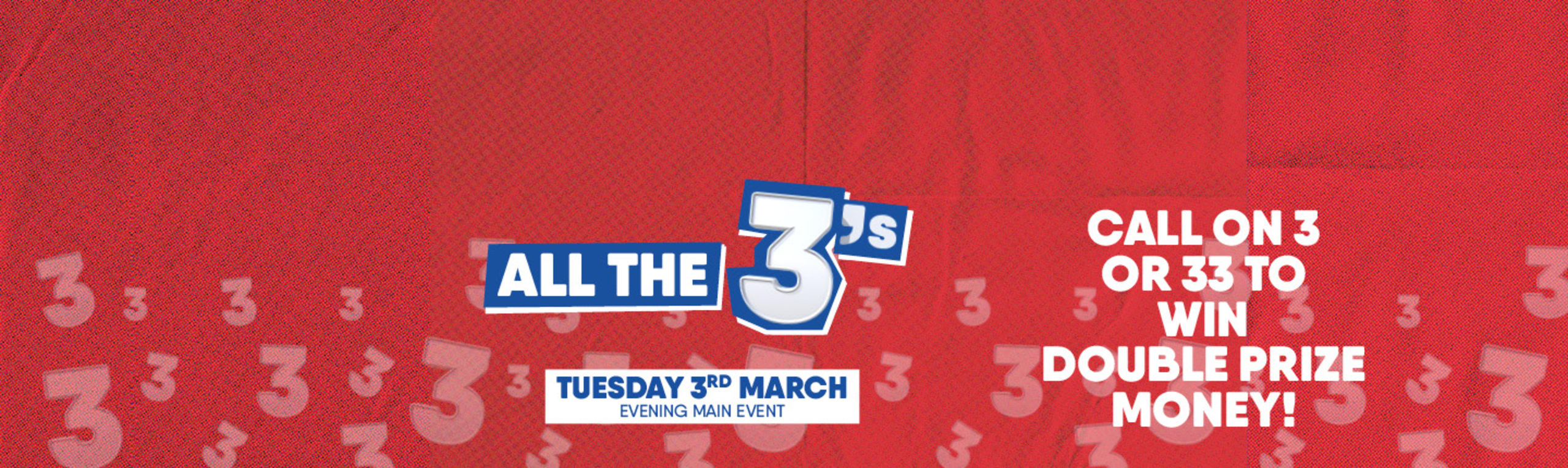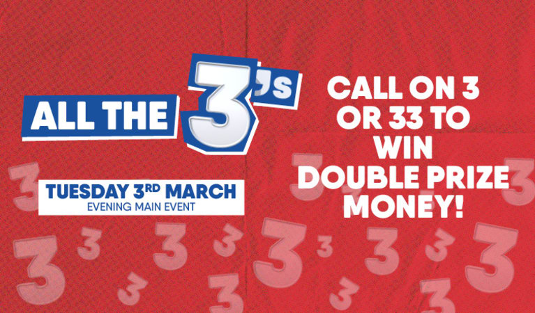 All The Threes! Head down to your local Buzz Club on Tuesday 3rd March, Evening Main Event for a chance at DOUBLE PRIZE MONEY when you call house on 3 or 33!