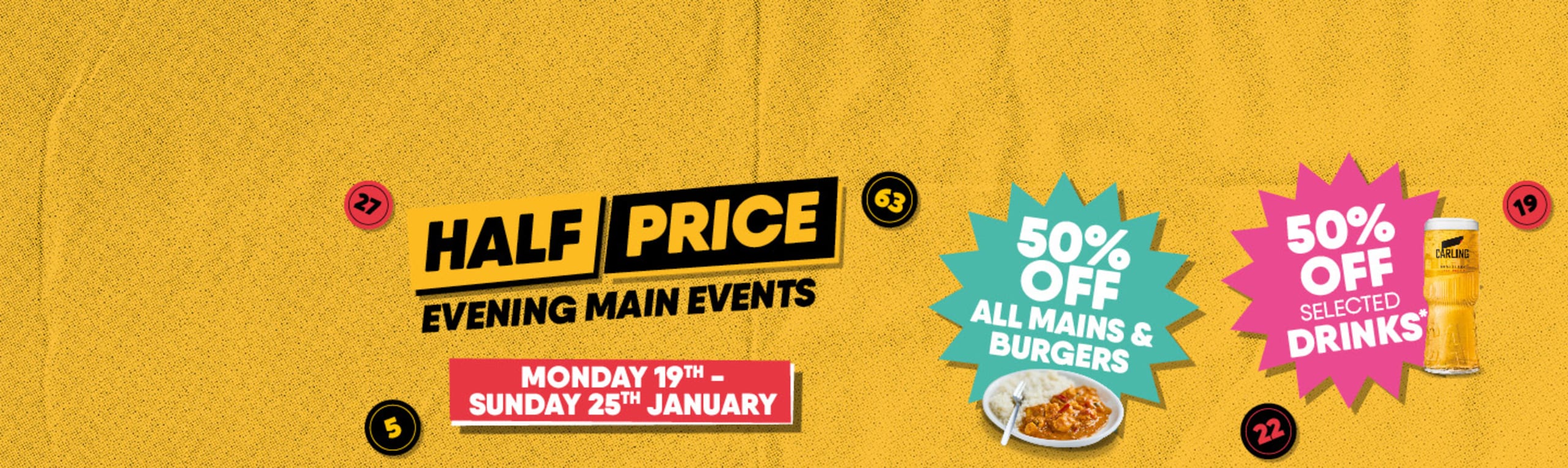 The legal stuff: All information is for this Buzz Bingo club only. Prices shown are for advertised sessions only and replace any other advertised prices. Main Event prize money advertised in club is estimated and therefore subject to change depending on ticket sales. In the event of multiple winners, the prize money will be split equally. Prices stated are for Main Event only unless stated otherwise. Optional games and touchscreen combo packages incur additional costs. Buzz Bingo general terms apply. Members only. *Half price drinks exclude Freixenet 20cl & 75cl, large bottles of wine, small bottles of wine, Madri & soft drinks in cans. Please drink responsibly. Clubs reserve the right to stop serving alcohol in line with club terms. Half Price Food refers to all Main meals and Burgers. Owing to our multifunctional kitchen cooking procedures, all fried items may contain traces of all allergens. While we take care to preserve the integrity of our vegetarian/vegan products, we advise that they are prepared in a multi kitchen environment. Please ask a member of the team for allergen and calorie information. We operate a “Think 25” policy, photographic ID will be required. Enjoy the game and play responsibly. Visit www.gambleaware.com or call GamCare free on 0808 802 0133.