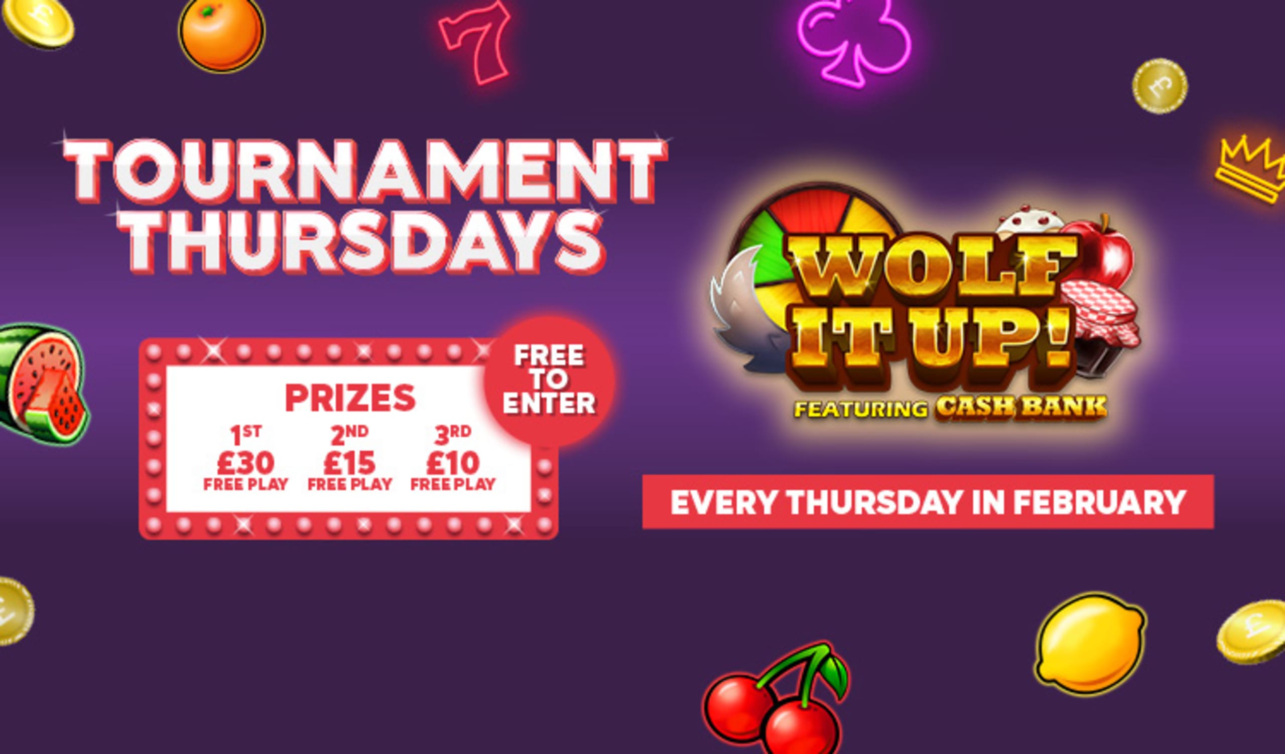 1st prize is £25 Free Play to play slots with, 2nd prize is £15 Free Play and 3rd prize is £10 Free Play. It’s free, any cash you win with your prize is yours to keep, and our jackpots go up to £500! So why not give it a go, right?